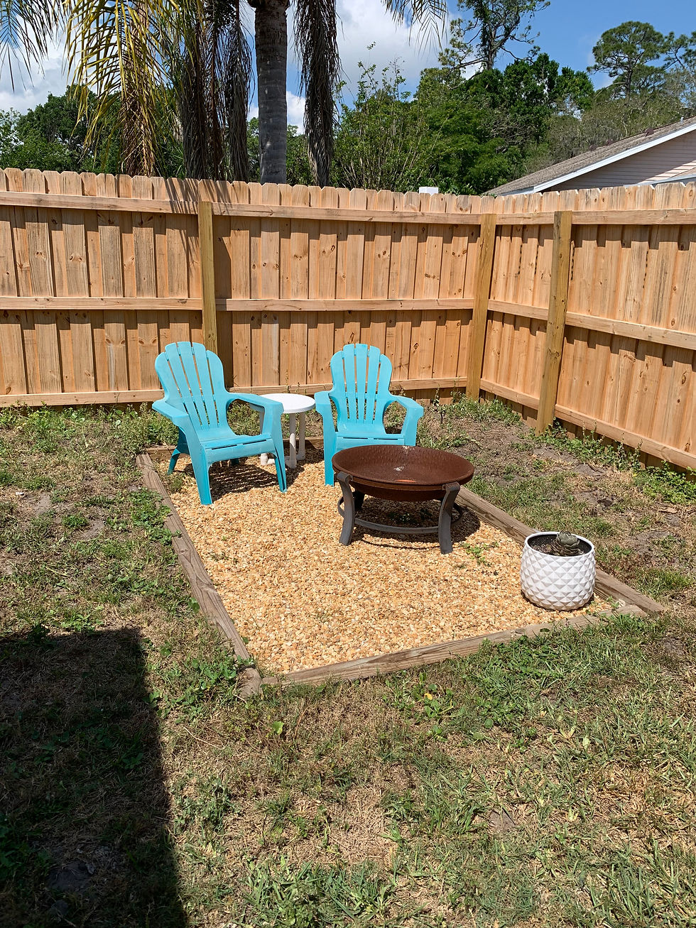 As you can see, this picture was taken recently quite some time after we had finished the area. We had a new fence installed after the two hurricanes we had at the end of last year and they also removed that tree in the corner. We are now thinking of replacing the chairs and we're definitely going to be getting a new fire pit. I have the happiest little succulent in that white planter pot and plan to add more!